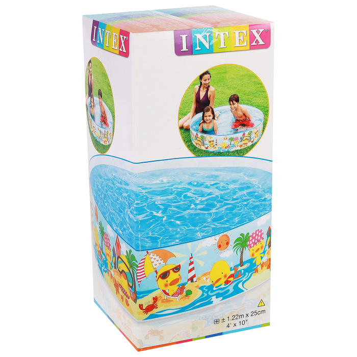 Бассейн каркасный Intex "Утёнок" 58477 - детский каркасный бассейн небольшой глубины отлично подойдет для купания вашего малыша в жаркий летний день. Небольшой объем бассейна позволяет воде быстро прогреваться под солнечными лучами. Этот удобный бассейн с полупрозрачными жесткими стенками очень функционален. Он не требует специальной подготовки, его не надо надувать, просто необходимо развернуть и залить водой.